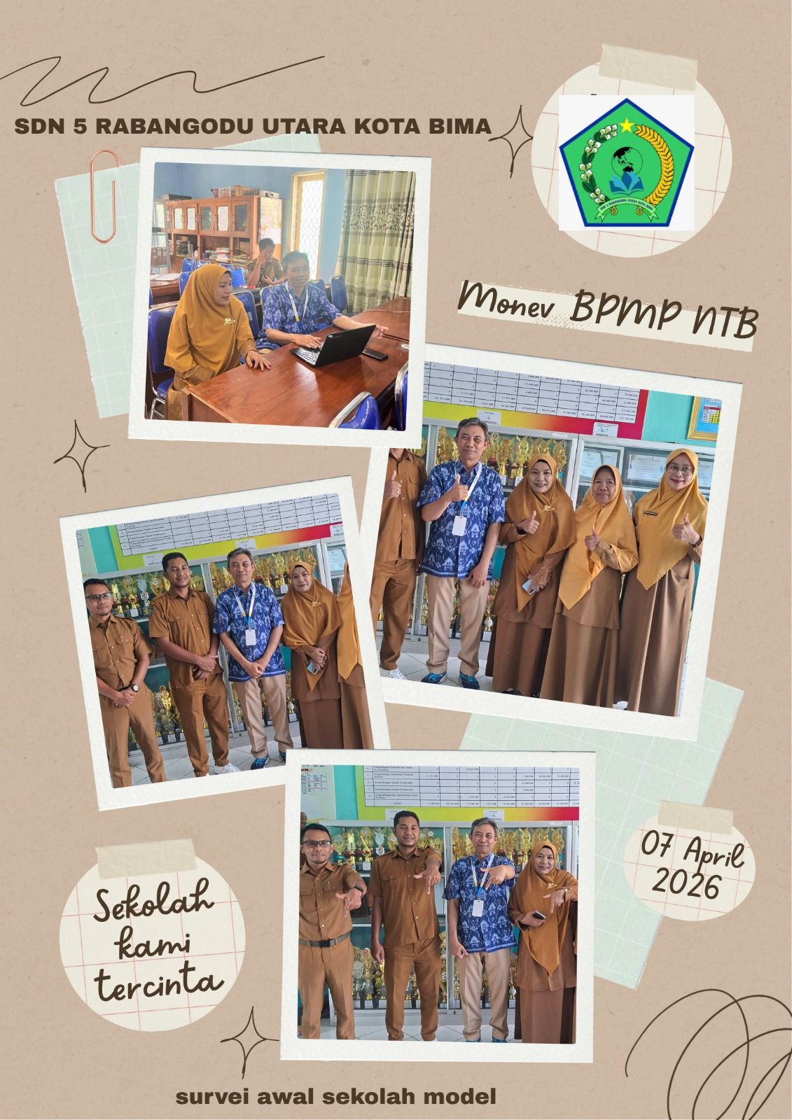 Kota Bima. Moment Tim Monev BPMP NTB Kunjungi SDN 5 Rabangodu Utara Kota Bima bersama perwakilan Dinas Dikpora Kota Bima Bapak Mukhti yang didampingi dan disambut langsung ibu kepala sekolah Minarni, S.Pd,SD, Dedi Sofian, M.Pd, Hj Nurhaidah dan Sri Anggriani, S.Pd.
